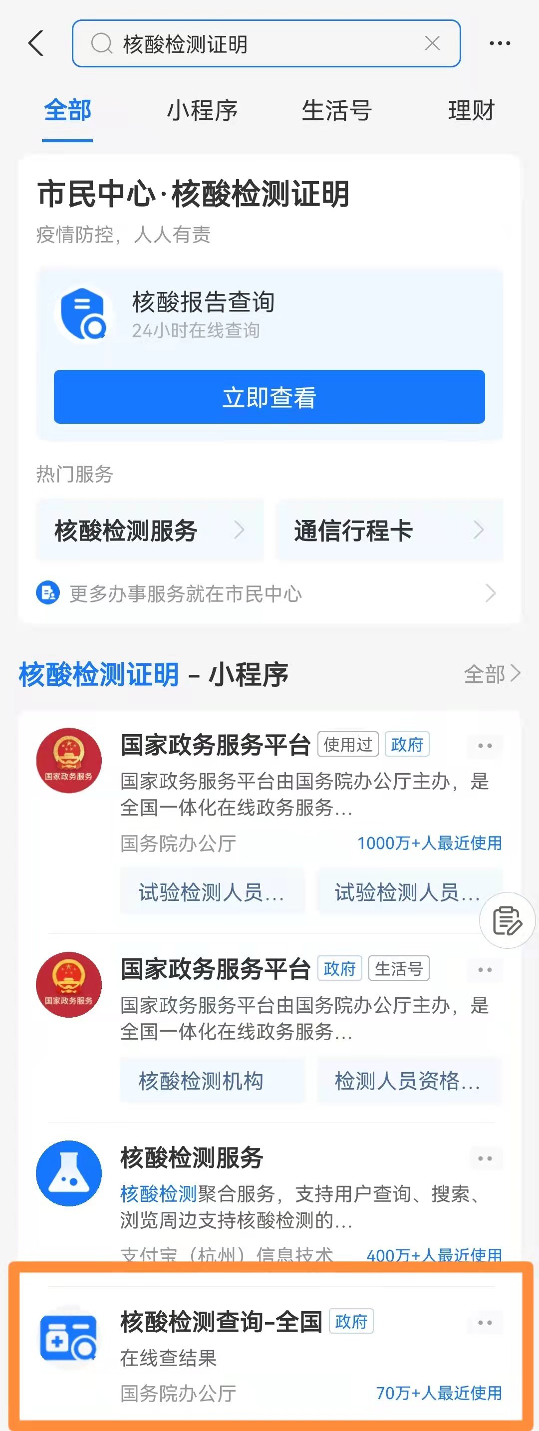 7、愿检尽检采样不提供纸质报告,核酸检测结果可通过支付宝或浙里办APP查询,核酸检测结果报告时间不超过24小时。