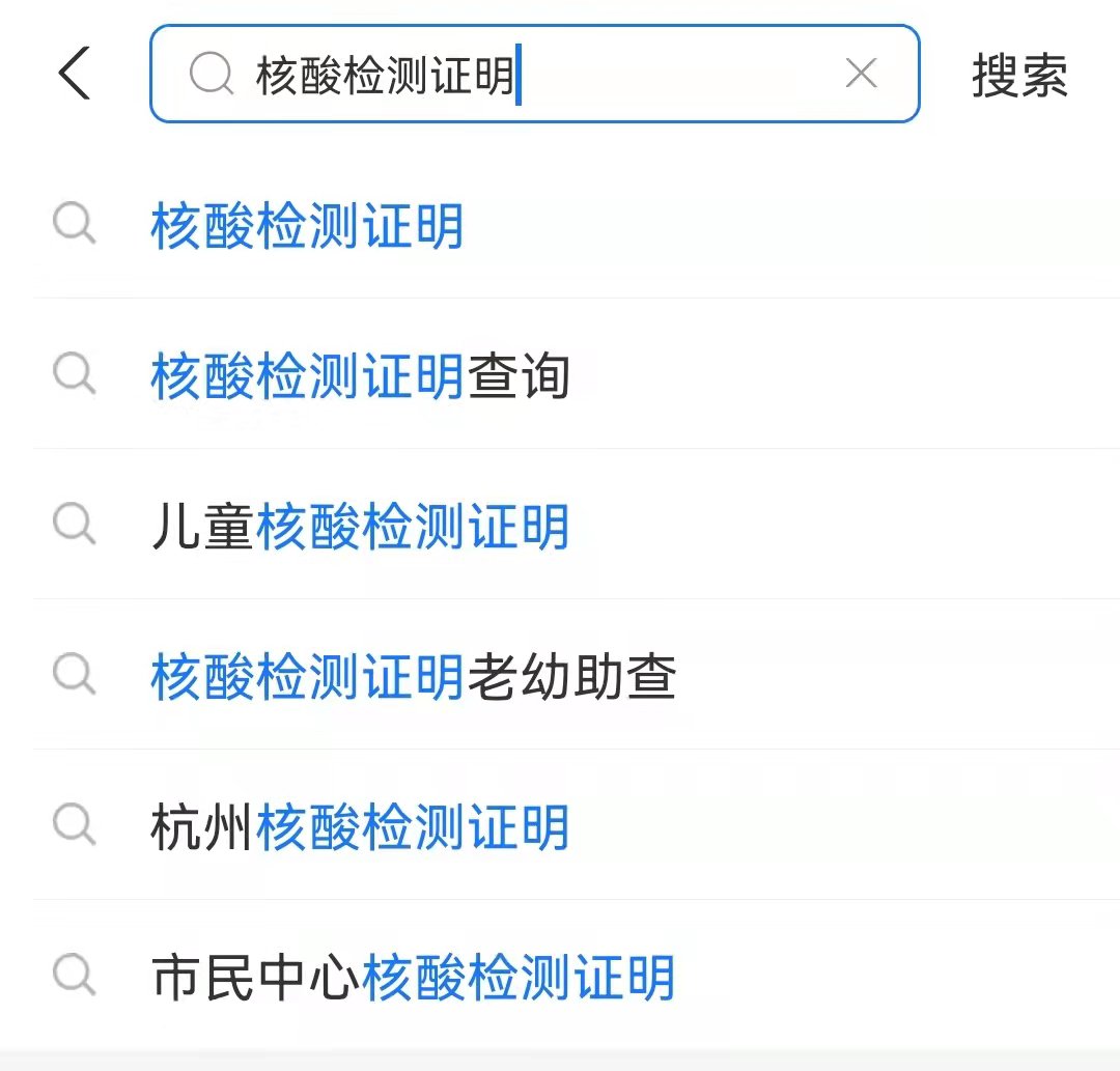 支付宝:搜索核酸检测证明→核酸检测→老幼助查→输入姓名和身份证号码→查询