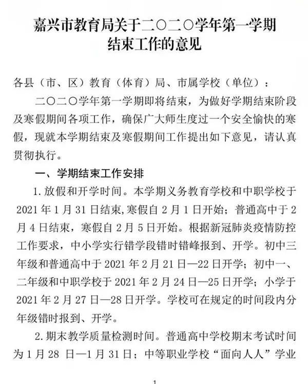 放假和开学时间。本学期义务教育学校和中职学校于2021年1月31日结束,寒假自2月1日开始;普通高中于2月4日结束,寒假自2月5日开始。