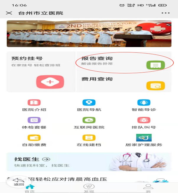 ·进入公众号消息界面,如下图所示,点击个人中心,再点击弹出菜单中的微官网。已经绑定的用户可以直接选择挂号缴费中报告查询。