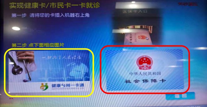 ·进入下图所示界面,根据自身插入的卡类型进行选择。健康台州一卡通点击黄框所圈图片,社会保障卡点击红框所圈图片。