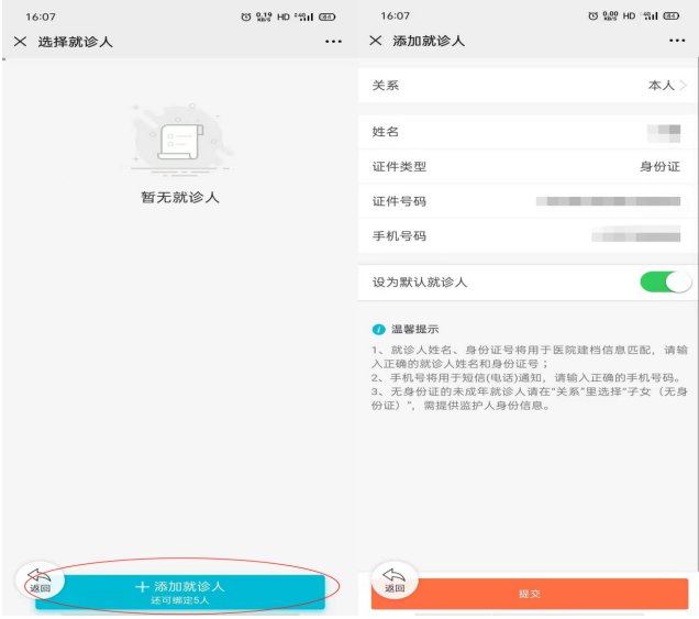 ·登录成功后,进入就诊人选择界面,点击选择。选择就诊人,首次使用需要添加就诊人,点击下图红框所圈按钮。