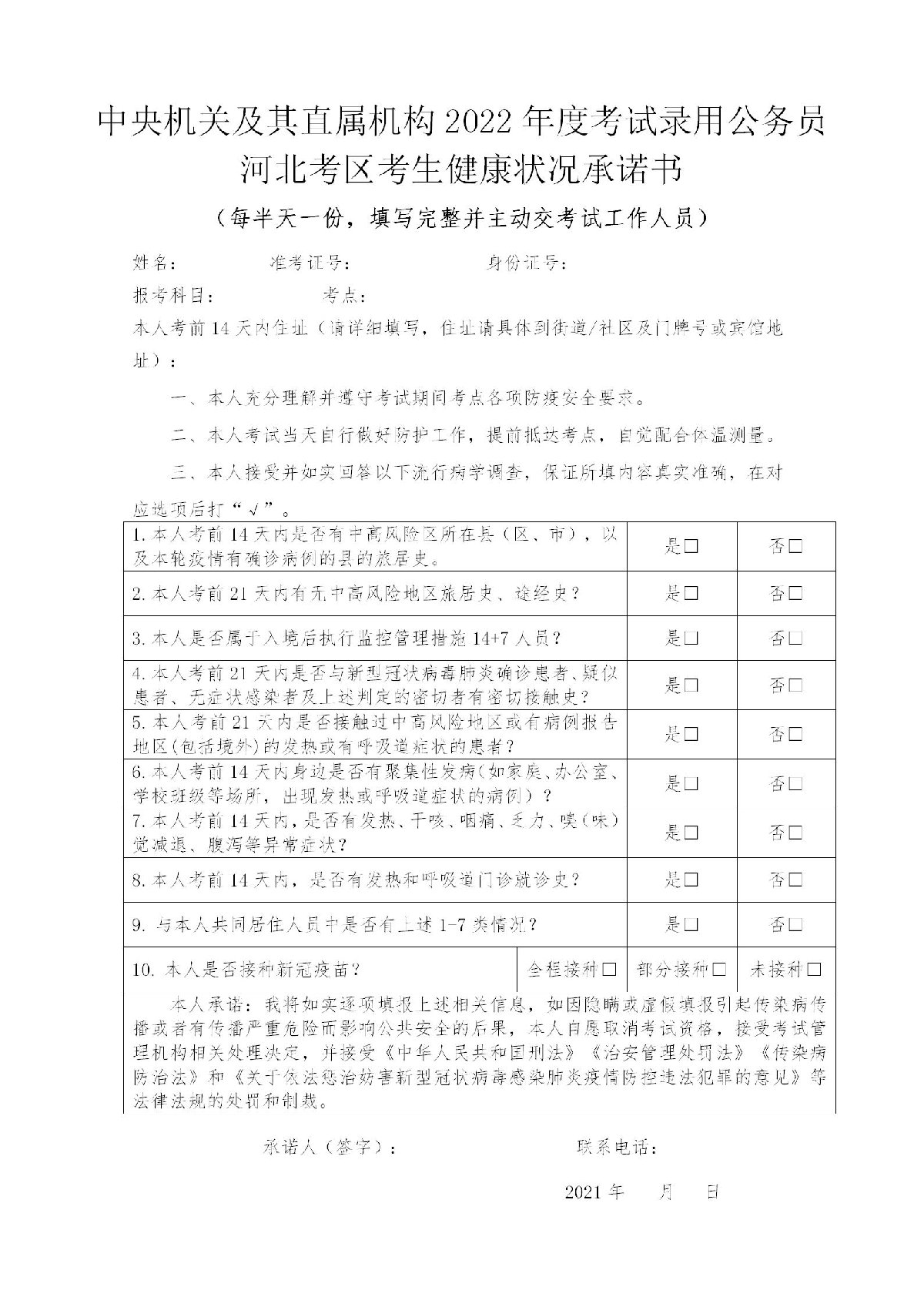 中央机关及其直属机构2022年度考试录用公务员河北考区考生健康状况承诺书