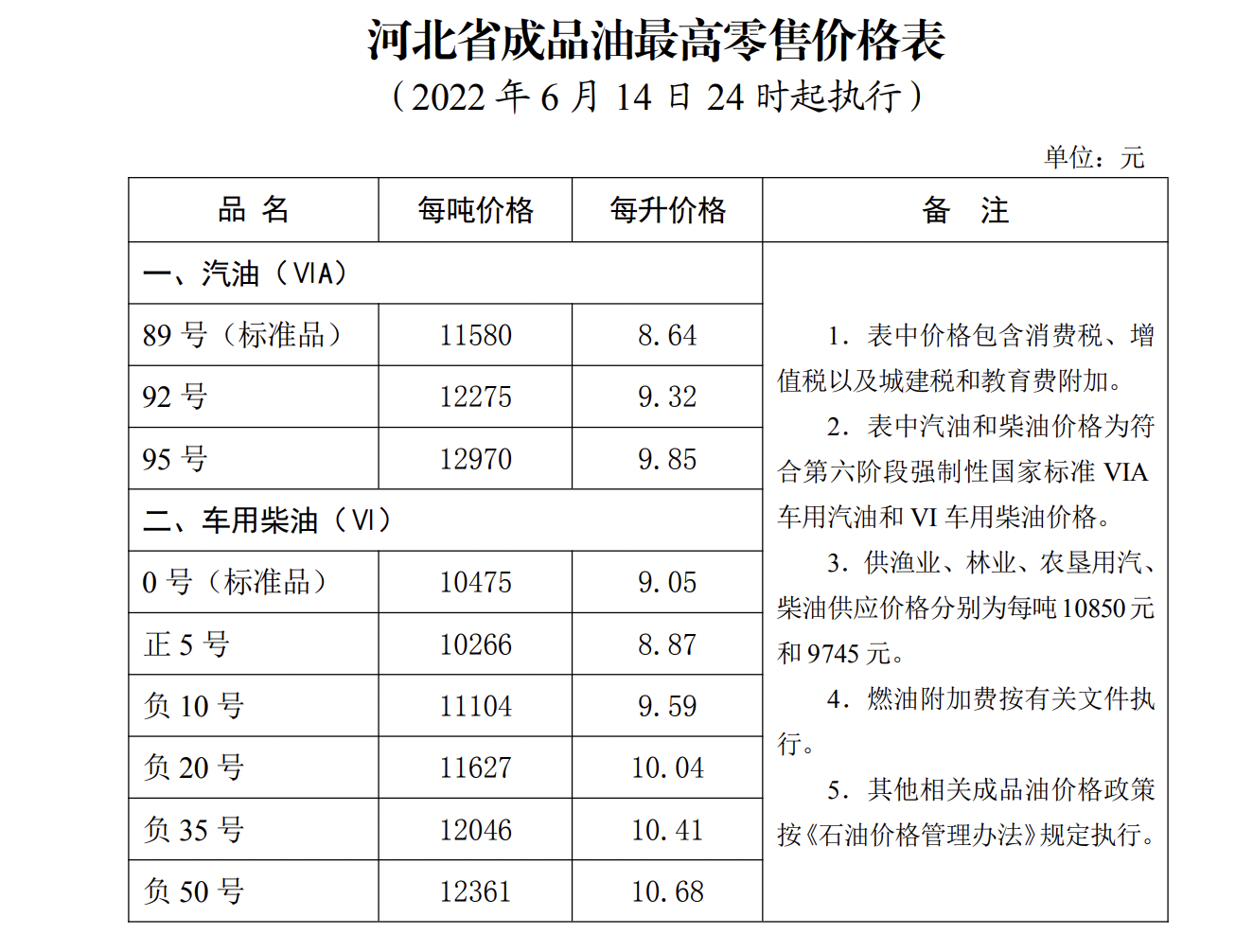 河北省发展和改革委员会关于调整我省成品油价格的公告(2022 年第11 号)根据现行成品油价格形成机制,自2022 年6 月14 日24时起,我省汽、柴油价格(标准品)每吨分别提高390 元、375 元,调整后的汽、柴油最高零售价格见下表。乙醇汽油价格按同标号汽油(VIA)价格执行,普通柴油价格按照同标号车用柴油(VI)价格执行,98 号汽油价格由成品油生产经营企业根据市场情况自主制定具体价格。