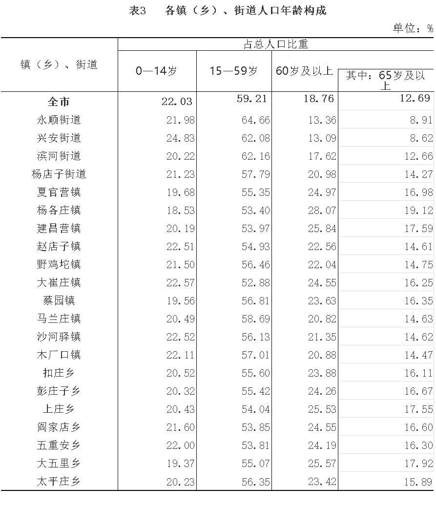 全市常住人口中,0-14岁人口为171153人,占22.03%;15-59岁人口为459886人,占59.21%;60岁及以上人口为145713人,占18.76%,其中65岁及以上人口为98595人,占12.69%。