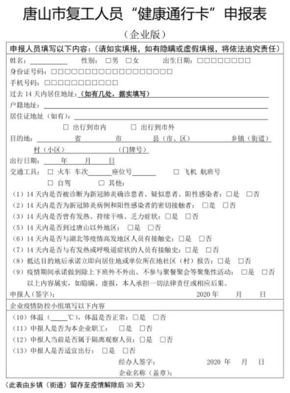 “健康通行卡”和《唐山市复工人员“健康通行卡”申报表》由市防控办监制,由各县(市、区)、开发区(管理区)防控办统一印制,发放至乡(镇)、社区(村)。“健康通行卡”和《唐山市复工人员“健康通行卡”申报表》也可由申请人在“中国唐山”网站自行下载打印。