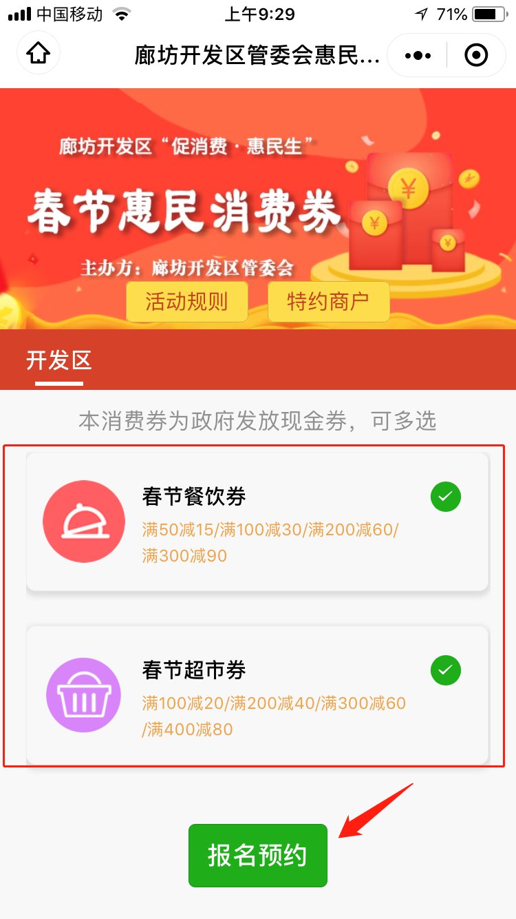 预约领取入口:“廊坊开发区管委会惠民电子消费券”微信小程序