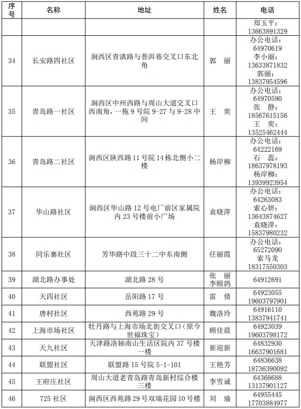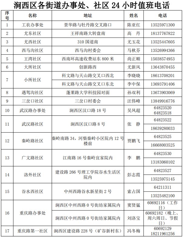 涧西区各街道办事处、社区24小时值班电话(2022年3月29日更新):