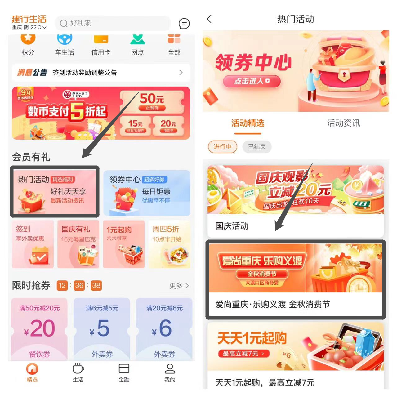 领取方式:市民可通过进入“建行生活APP”首页【热门活动】,免费领取大渡口“爱尚重庆·乐购义渡”政府通用消费券。