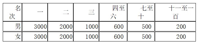男、女第1至第200名运动员分别获得奖金(人民币),前三名并颁发奖杯一座及领奖服一套。