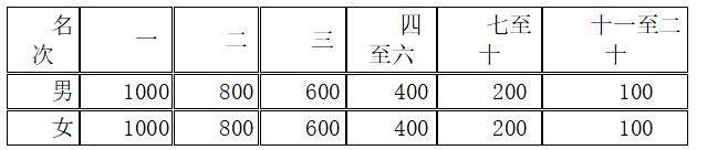 1、名次奖:男、女第1至第8名运动员分别获得奖金(人民币),前三名颁发奖杯一座及领奖服一套。