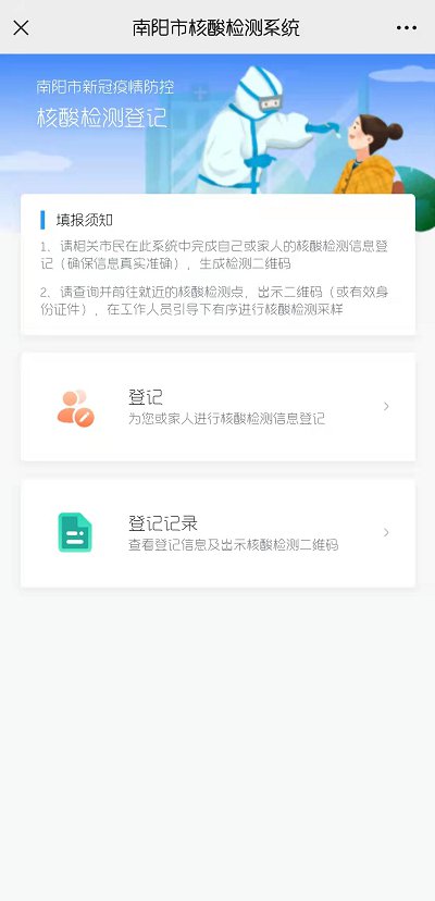 使用微信关注公众号“健康南阳通”或扫描二维码进入系统“全员核酸检测登记”;