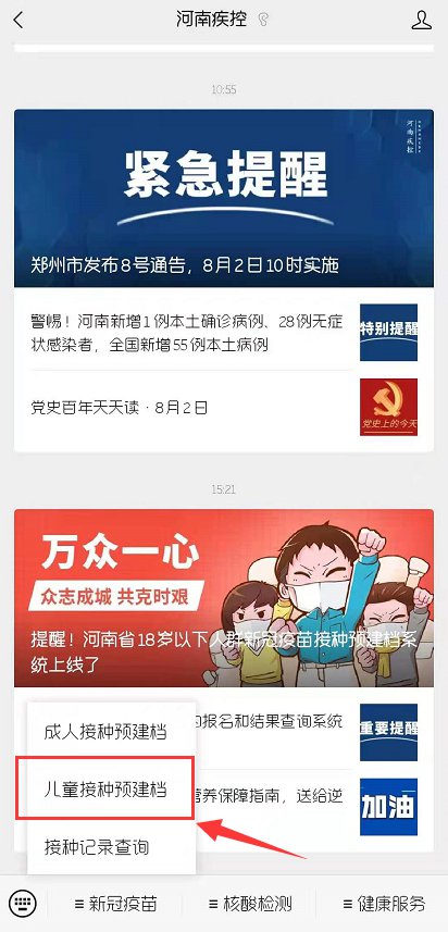 第四步:在界面下方的菜单栏点击【新冠疫苗】,在弹出的子菜单中点击【儿童接种预建档】。