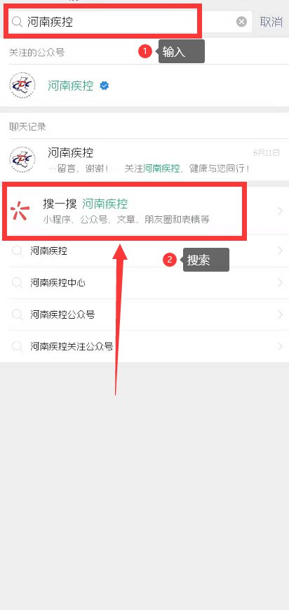 第二步:在搜索框中输入【河南疾控】,点击【搜一搜】。