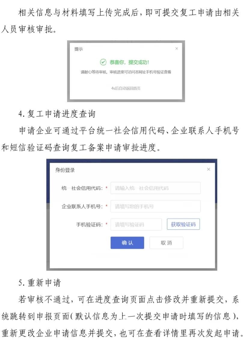 4.复工申请进度查询申请企业可通过平台统一社会信用代码、企业联系人手机号和短信验证码查询复工备案申请审批进度。