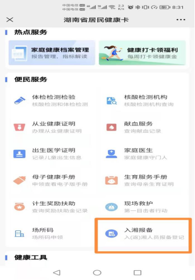 1、在湖南居民健康卡“便民服务”中点击“入湘报备(入<返>湘人员报备登记)”。