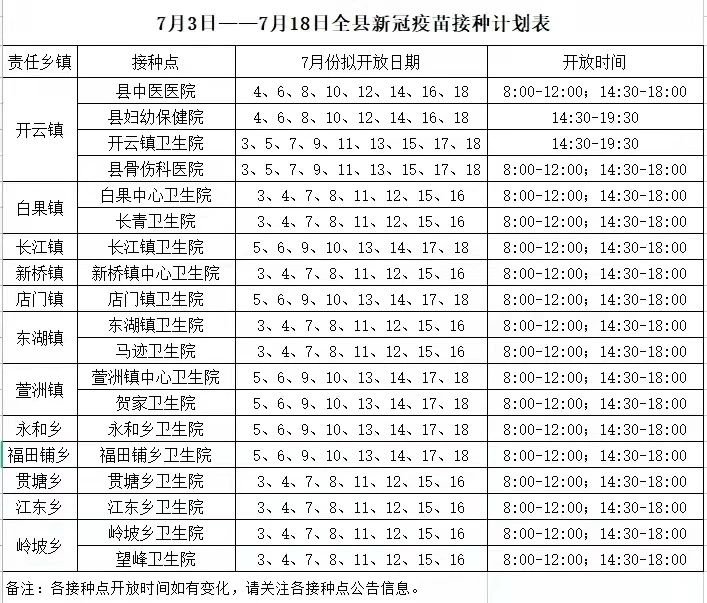 7月3-18日各接种点开放时间见下表:
