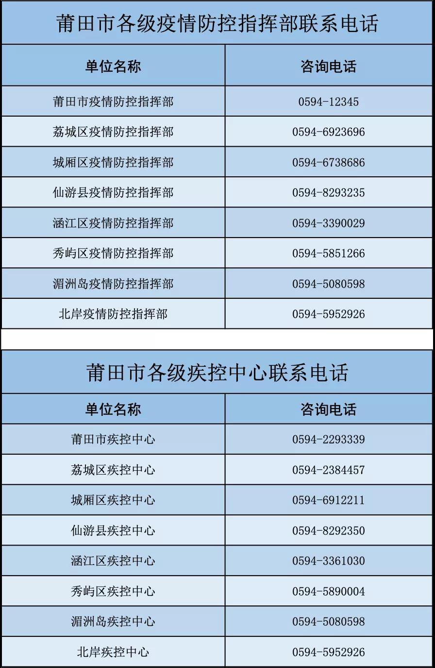 莆田市各级疫情防控指挥部+疾控中心联系电话
