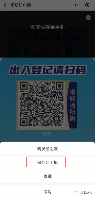 2.申请成功后,即可生成专属场所二维码,点击“打印场所码”后,长按屏幕后点击“保存到手机”,下载打印后,张贴在场所入口,到访人员即可进行扫码登记。