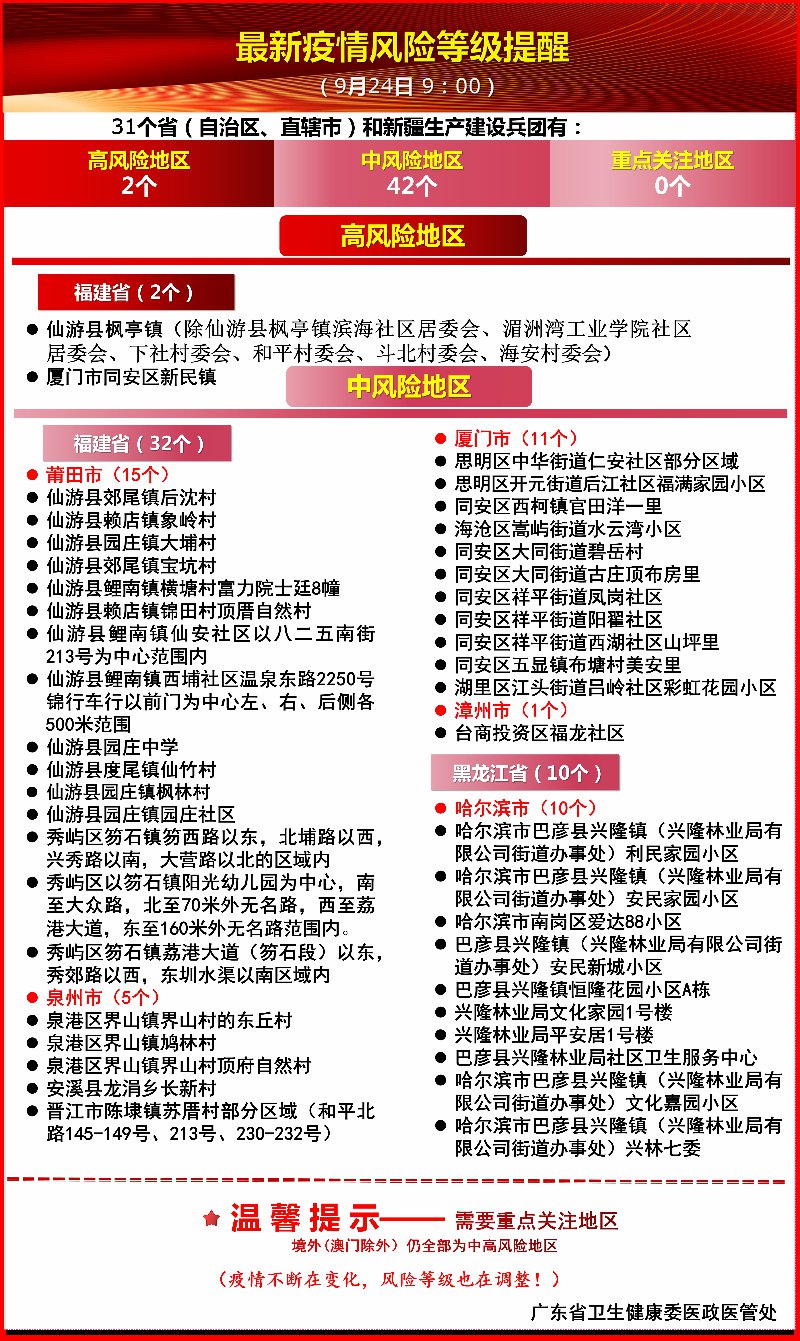 近期有福建省厦门市、泉州市、莆田市旅居史或9月7日以来有从哈尔滨市来(返)佛人员,请主动向所在社区(村)、所在单位、所住酒店报备个人行程情况。请自觉服从辖区措施安排,按安排做好核酸检测工作,并配合做好相应健康管控工作,详见《佛山市出行防疫政策》。