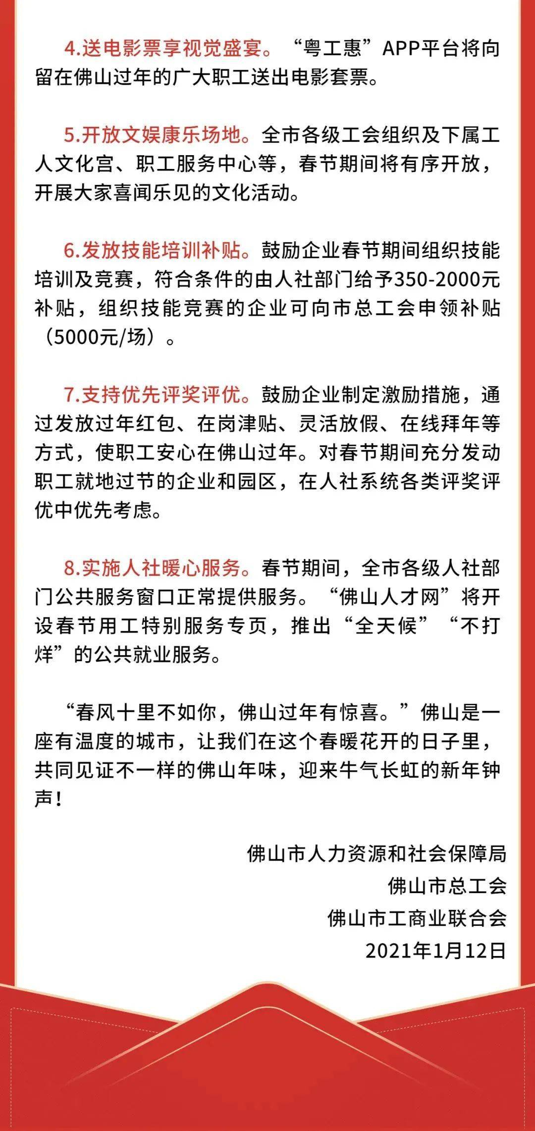 除此之外 佛山市人社局发出《留在佛山过年,新春欢喜连连——致全市企业家和职工朋友们的一封信》,佛山市人社局、总工会、工商联共同推出 8项大礼包,包括送消费红包、送门票和发放技能补贴等。