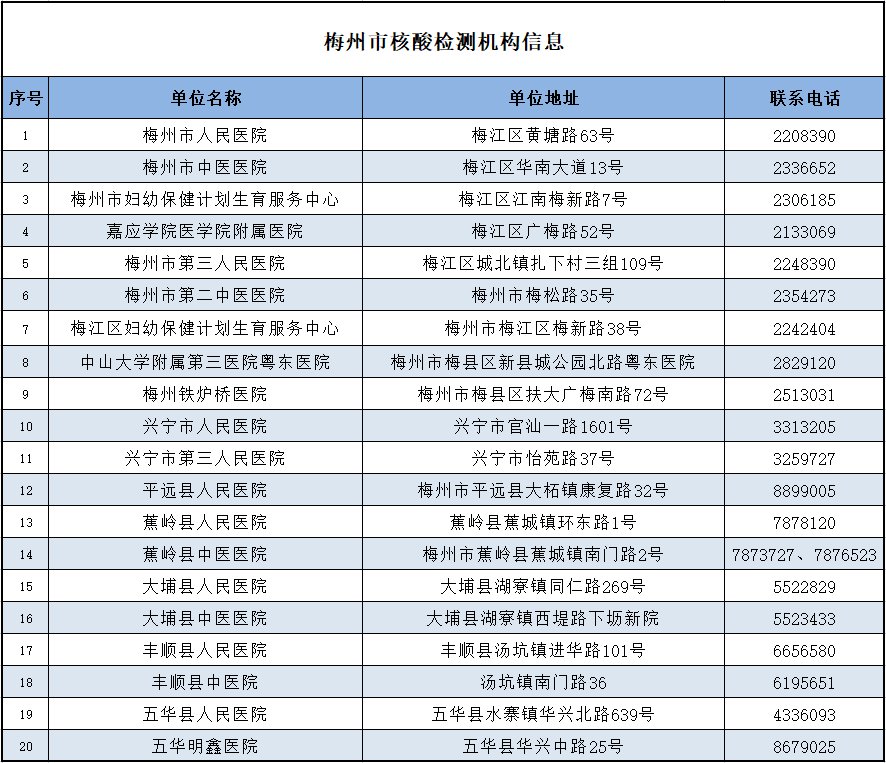 ➤为方便市民检测核酸,做好疫情防控工作,梅州市这20家医疗机构,将为市民提供24小时核酸检测服务,具体名单如下(注:服务点设置将根据疫情防控需要动态调整)