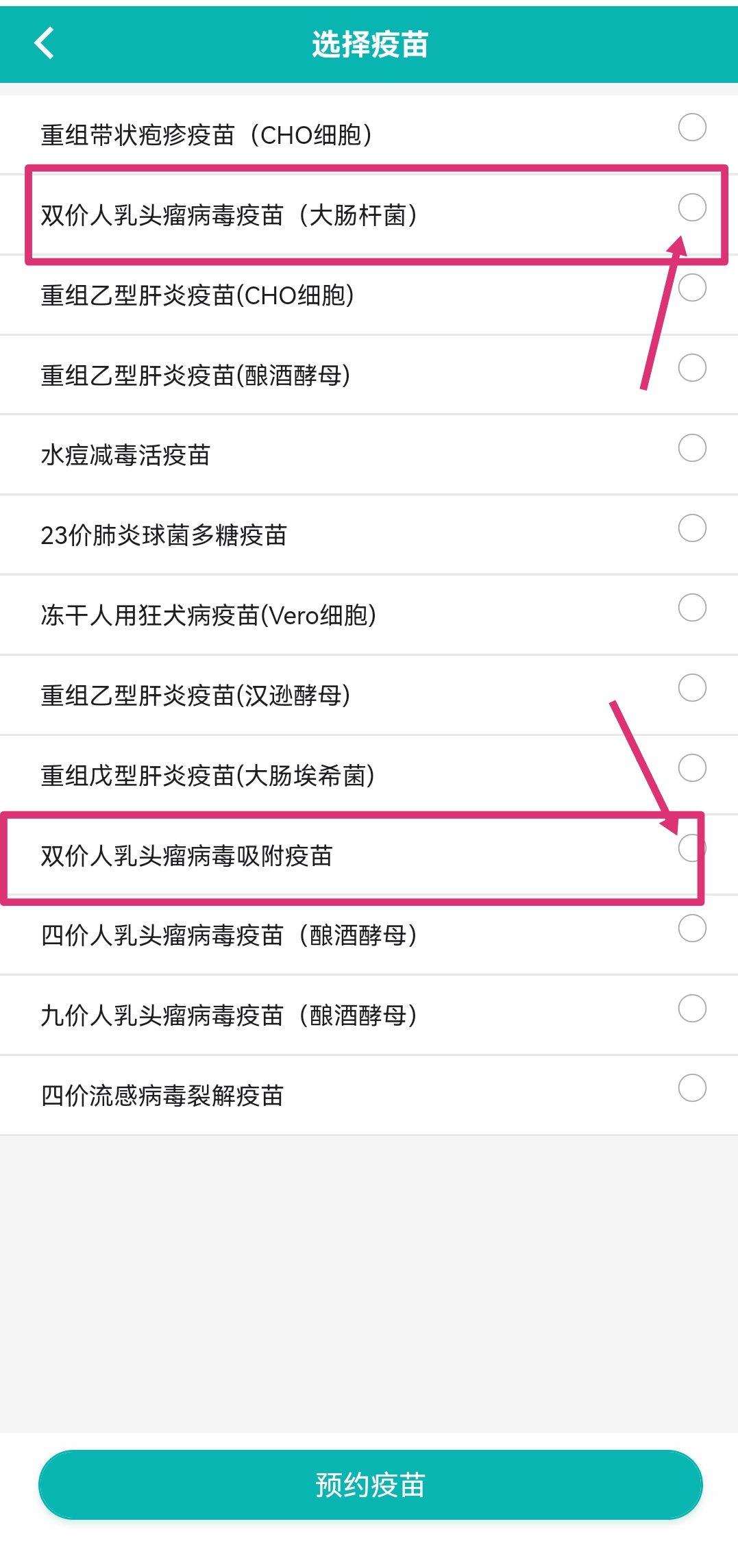 2、国产二价HPV疫苗全名为“双价人乳头瘤病毒疫苗(大肠杆菌)”,进口二价HPV疫苗全名为“双价人乳头瘤病毒吸附疫苗”,选择疫苗种类——选择城市(显示可预约的城市才能选择)