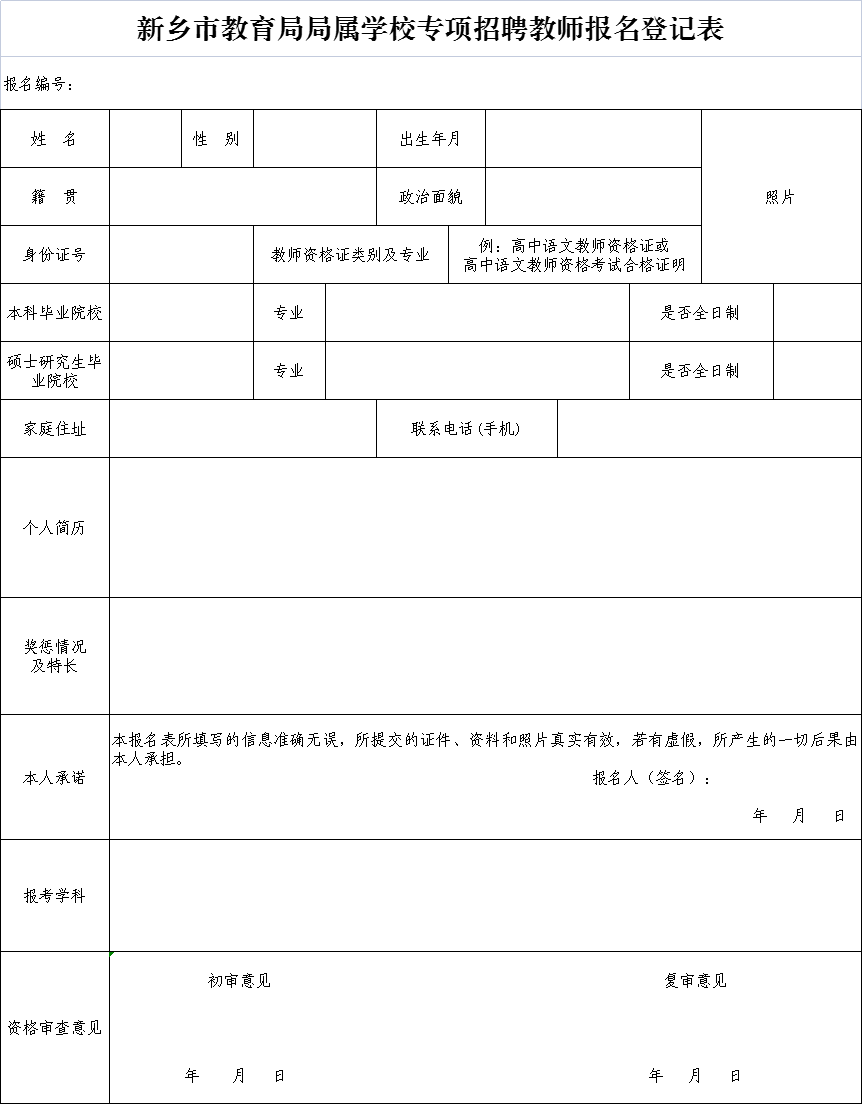 4.新乡市教育局局属学校专项招聘教师报名登记表(附件3),报名表需报考者本人签字;