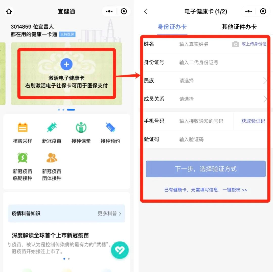 1、进入「宜健通」小程序,激活电子健康卡,按要求填写信息;