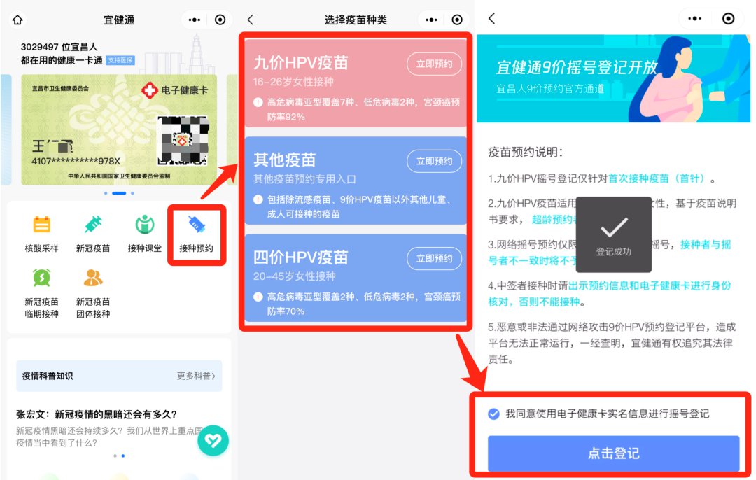 2、激活电子健康卡后,在「宜健通」小程序中,点击接种预约,选择预约的疫苗种类进行登记;