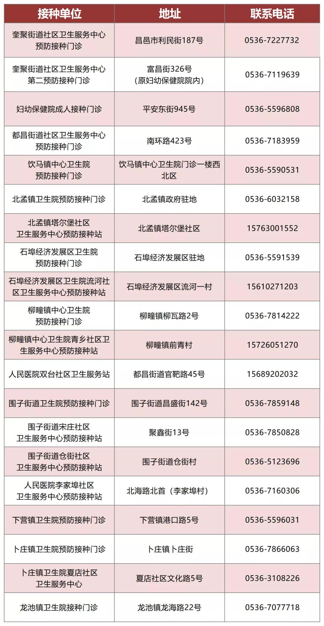 昌邑市流感疫苗接种门诊地址电话一览: