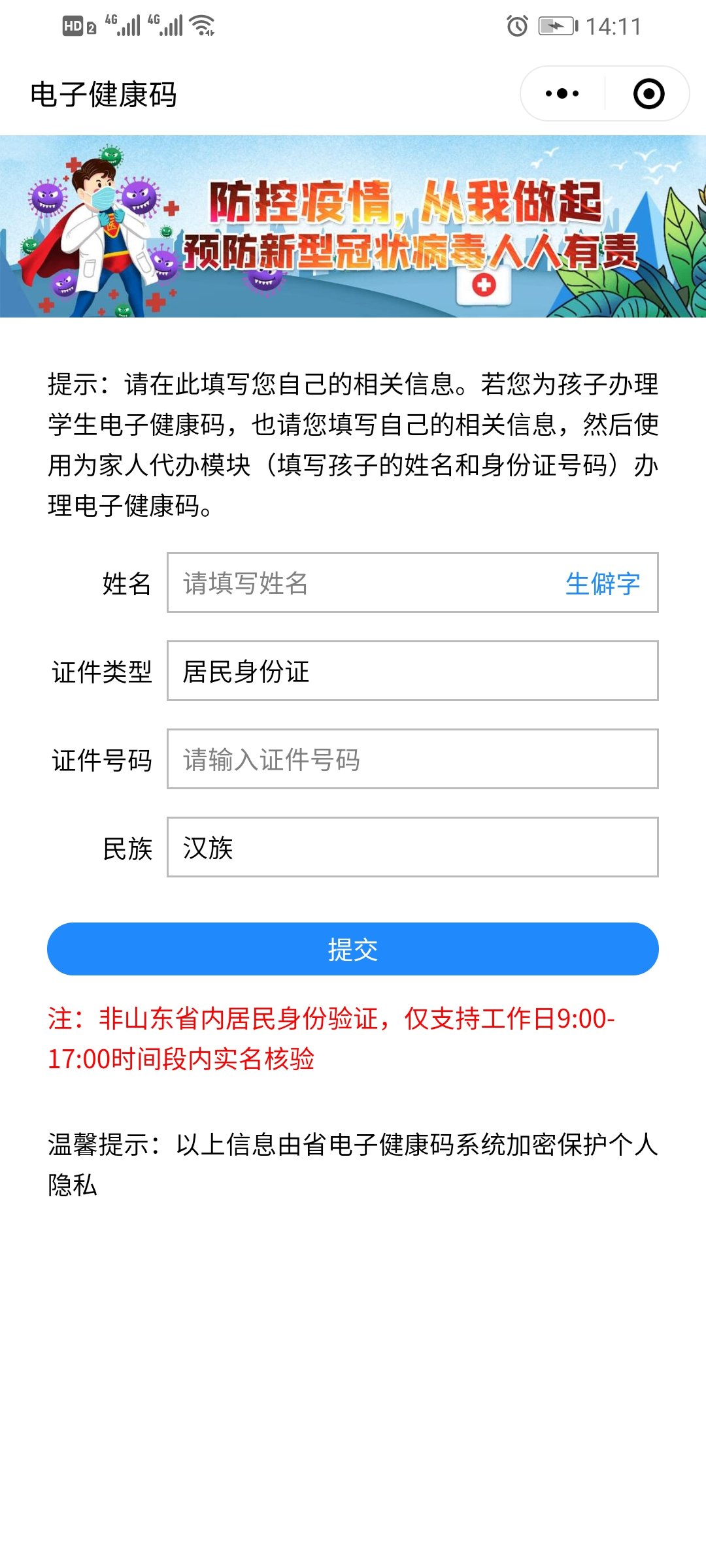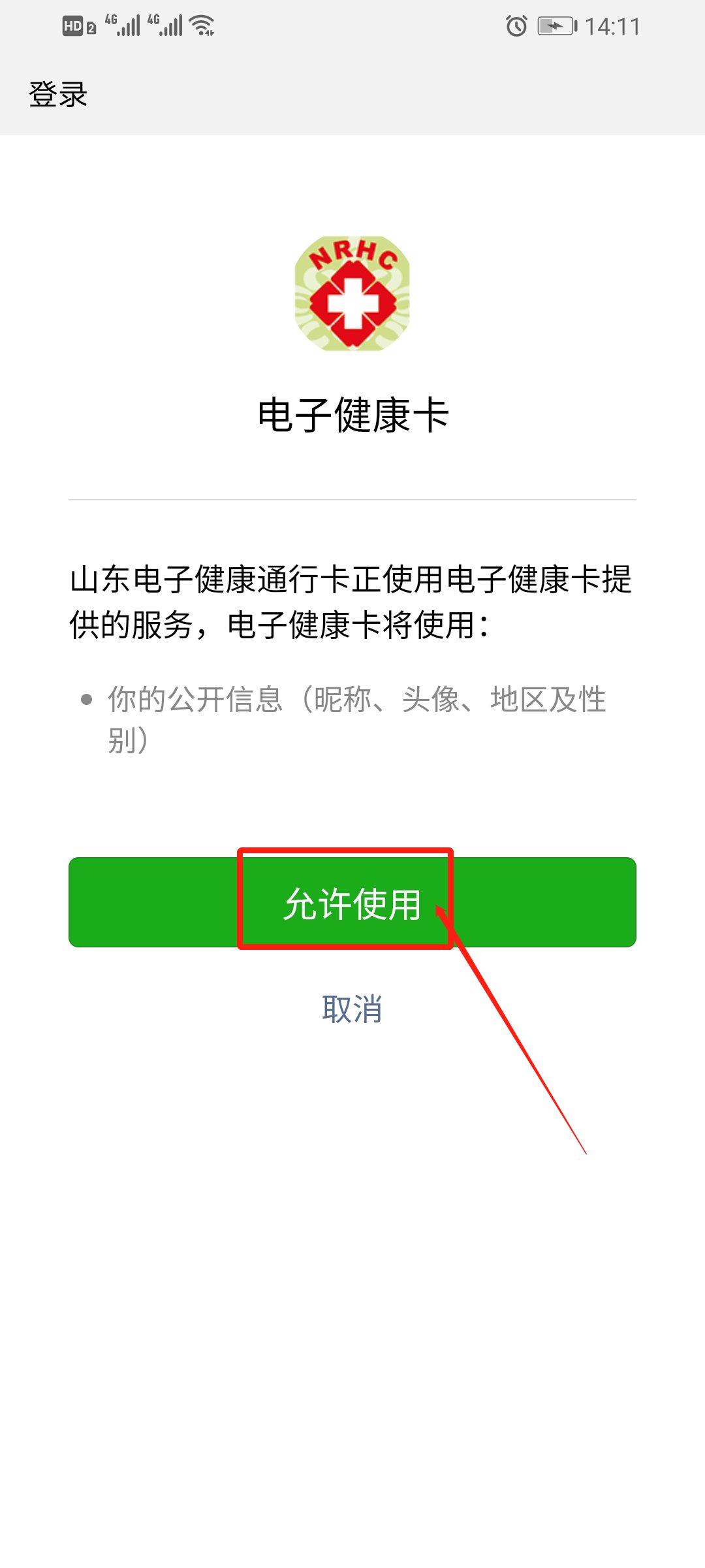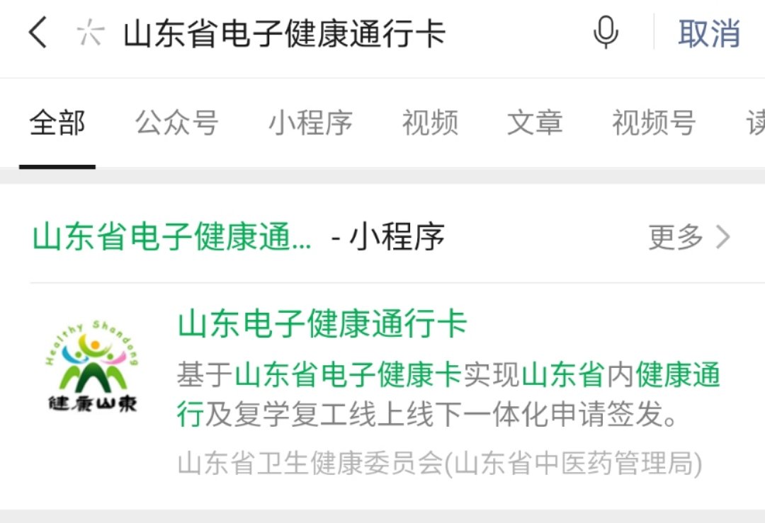 1、使用微信搜一搜“山东电子健康通行卡”小程序,或直接点击识别下方小程序码,然后点击进入;