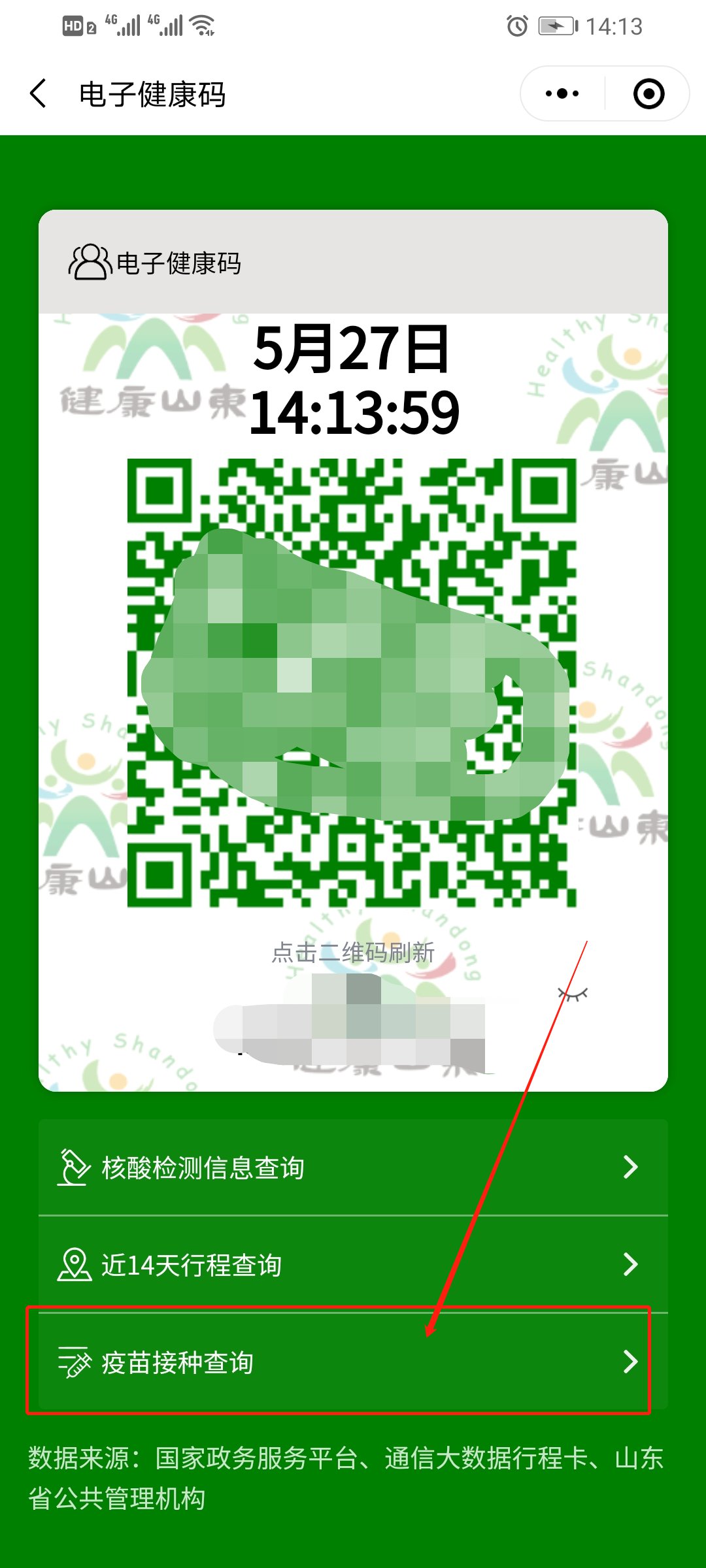 5、然后进入,在健康码下方点击“疫苗接种查询”;