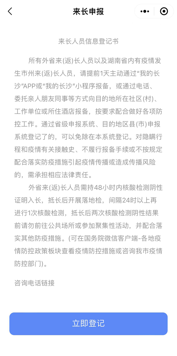 雨花区新冠肺炎疫情防控指挥部提示:外省来(返)雨花区人员请提前通过“我的长沙”APP或小程序向社区(村)报备。