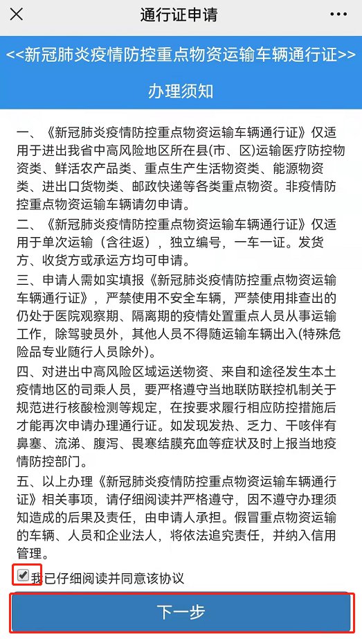 第四步:查看办理须知,勾选“我已仔细阅读并同意该协议”,点击“下一步”;
