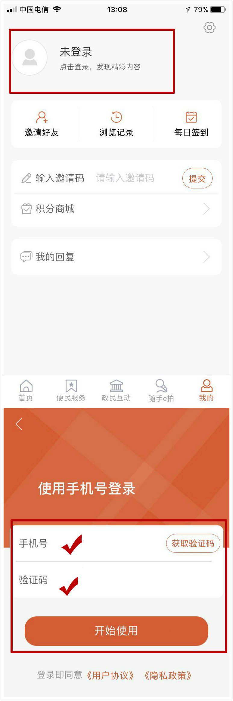 (3)输入手机号码,通过短信验证码注册登录。