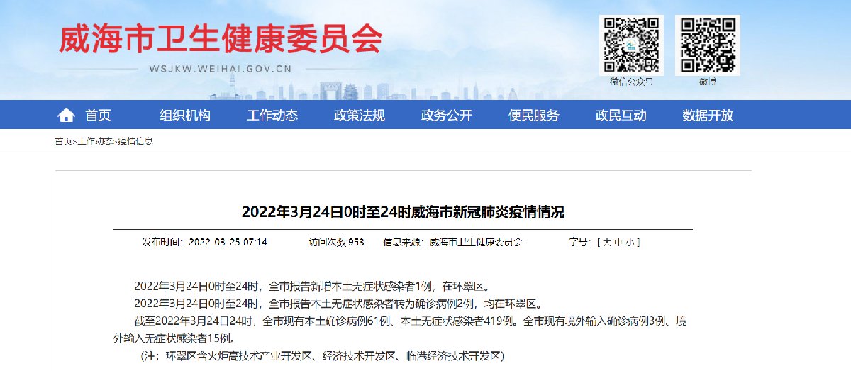 2022年3月24日0时至24时,全市报告新增本土无症状感染者1例,在环翠区。