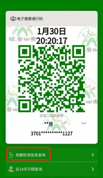 方式三:山东健康码—核酸检测信息查询。已经做完核酸检测的用户,不必再请假排队取检测报告了,健康码上就可以查询。只需要在健康码展示页面下方点击“核酸检测信息查询”: