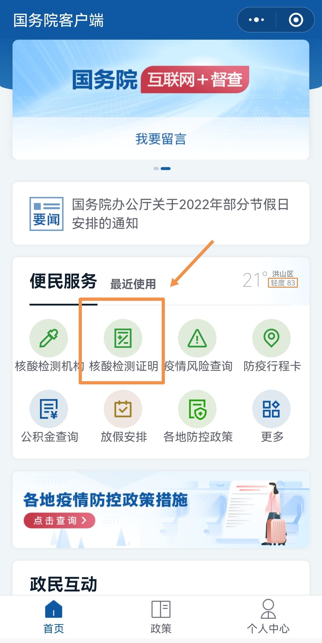 第一步:在便民服务中,点击核酸检测证明