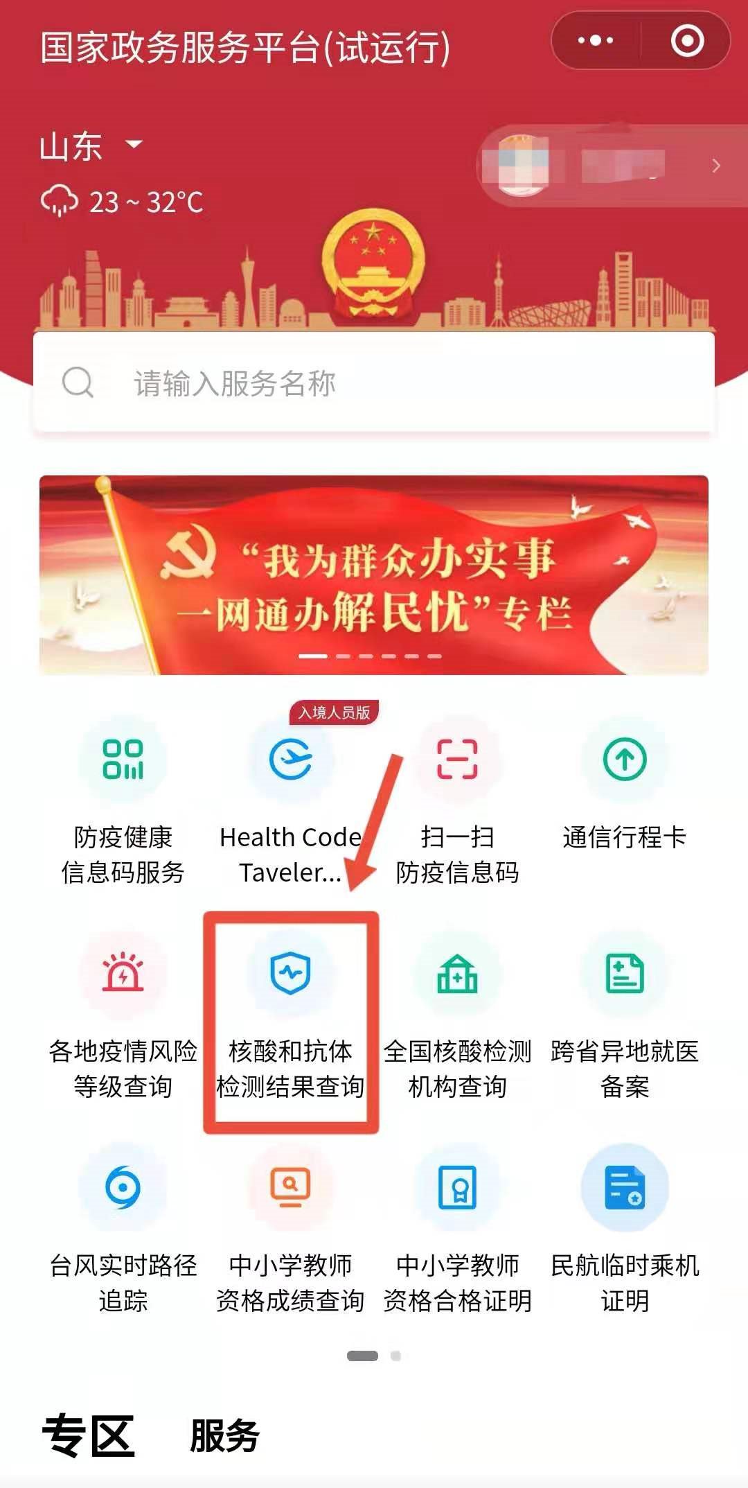 第二步,在热门服务中找到并点击“核酸和抗体检测结果查询”;