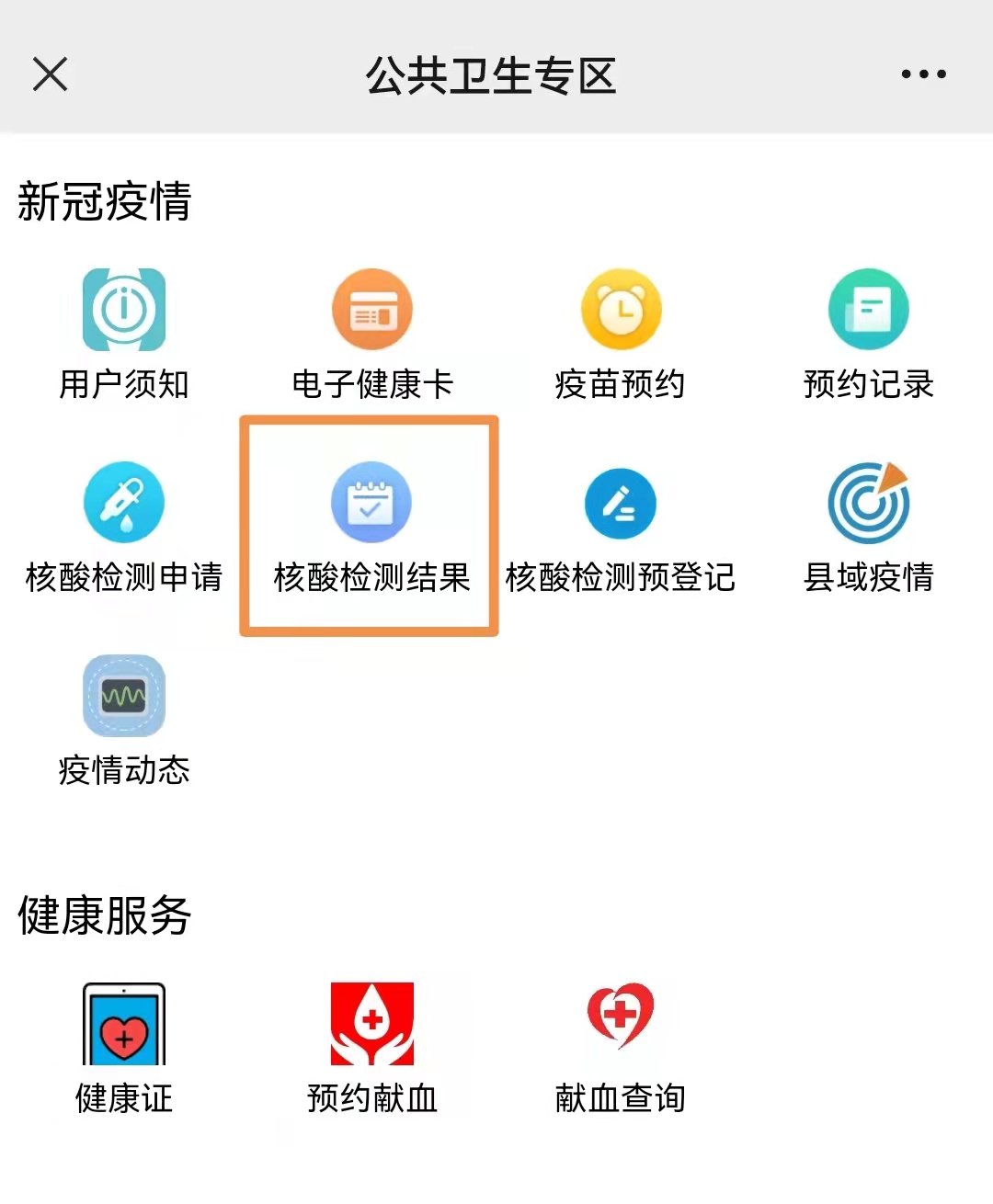 2、或者选择公共服务——公共卫生专区——核酸检测结果查询。