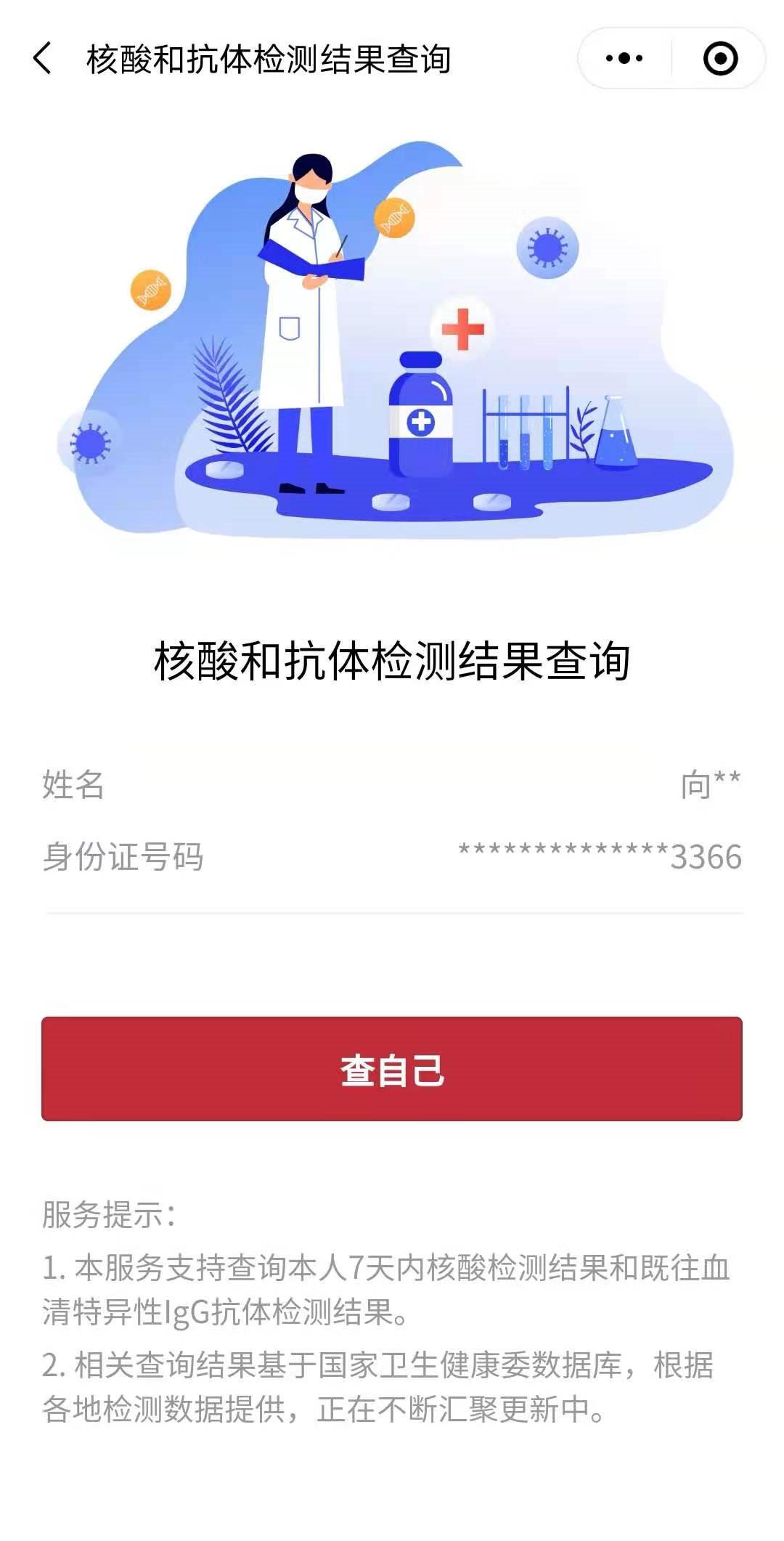 第四步,登录验证成功后点击“查自己”;接着即可查询到自己的核酸检测结果情况;