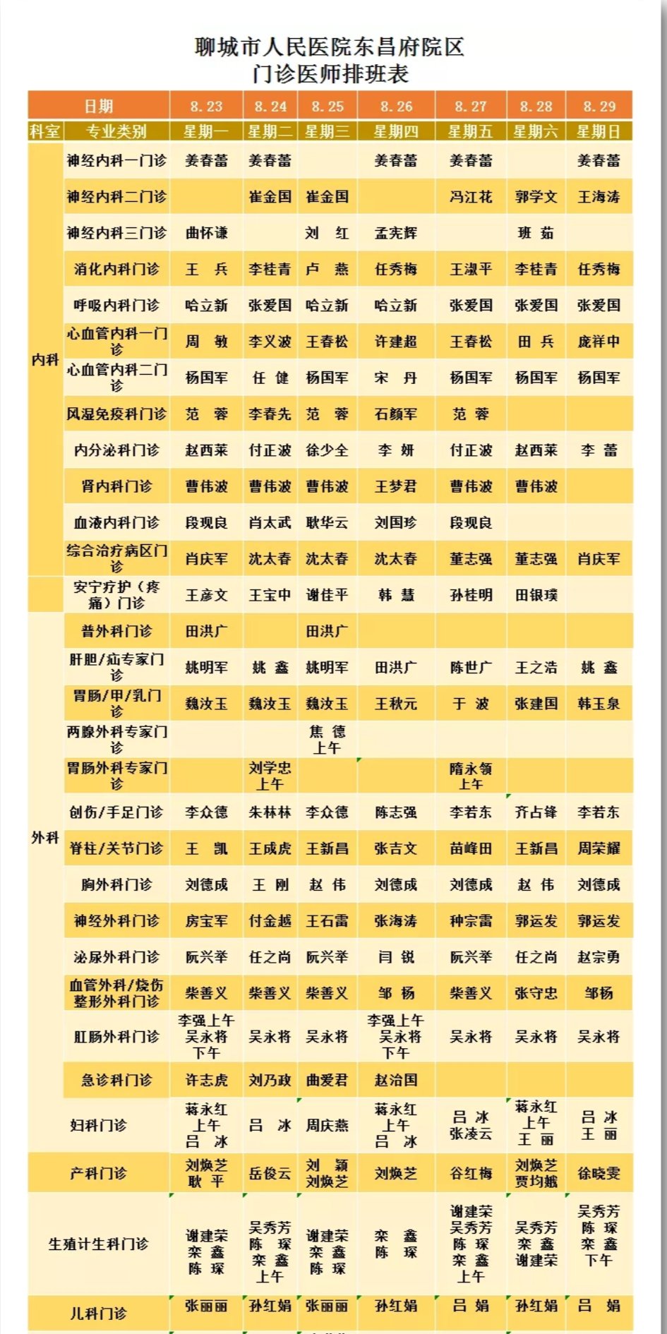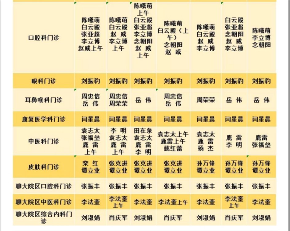 聊城市人民医院东昌府院区门诊排班表如下