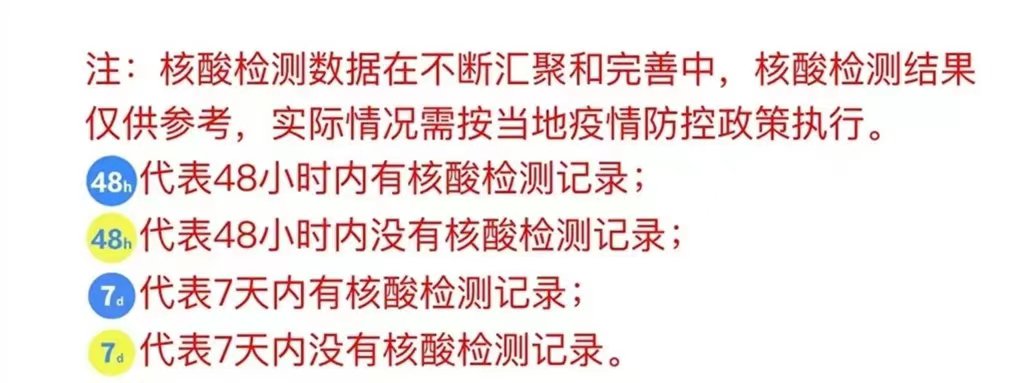 2.蓝色48h图标代表48小时内有核酸检测记录,黄色48h图标代表48小时内无核酸检测记录,蓝色7d图标代表7天内有核酸检测记录,黄色7d图标代表7天内无核酸检测记录。