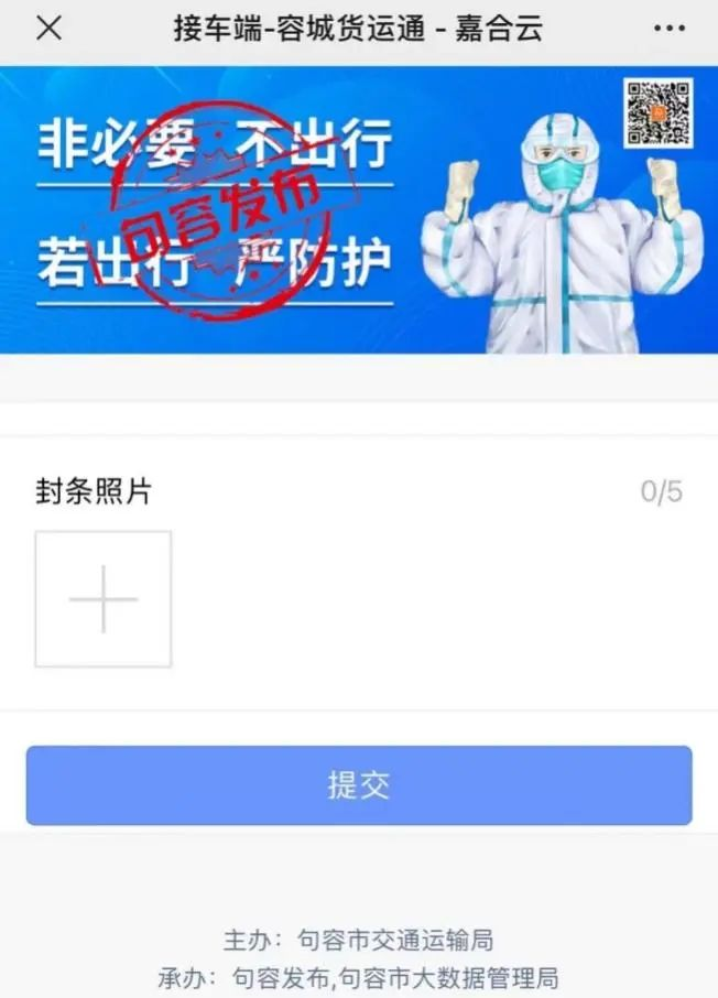 接车人接到货车后,应引导司乘人员进行核酸采样,张贴封条,拍摄上传封条照片(最多上传五张)。