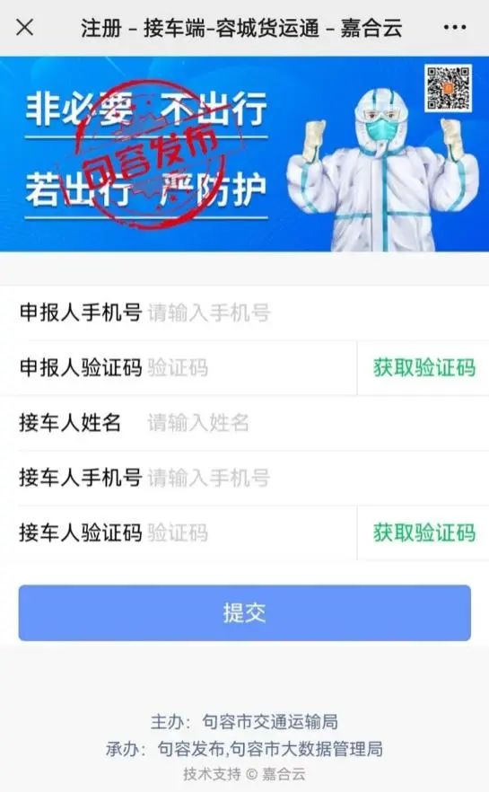 2.接车人微信。或者关注并进入“句容发布”微信公众号,点击菜单栏目:微服务-句容市疫情防控“货运通”接车。打开系统登录页面。