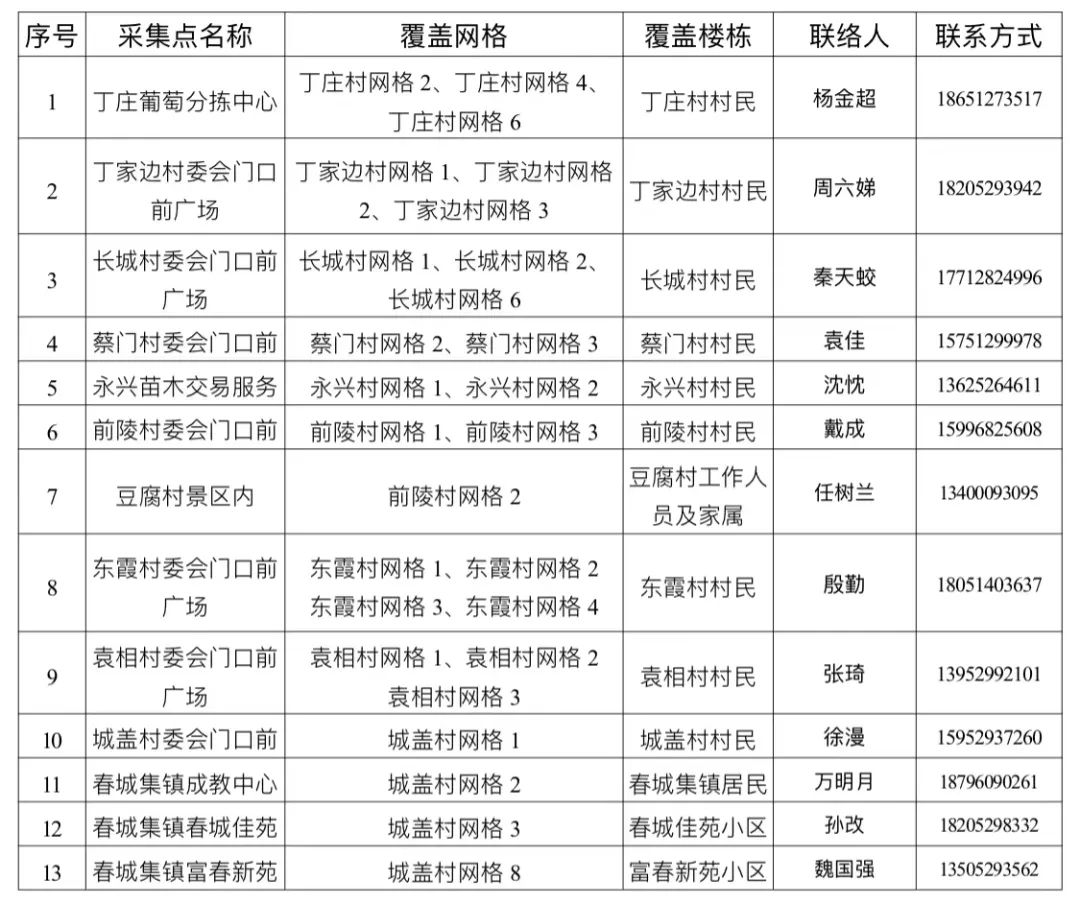 2.地点:以网格为单位,全镇设立13个核酸检测采样点(具体见附件),居民按照村委会通知要求到指定的采样点采样。