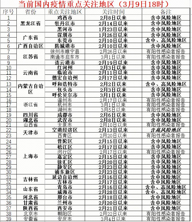 3月8日,天津市西青区报告4例新冠肺炎确诊病例;3月9日,安徽省安庆市报告1例新冠肺炎无症状感染者,上海市浦东新区沪东新村街道长岛路281号调整为中风险地区。