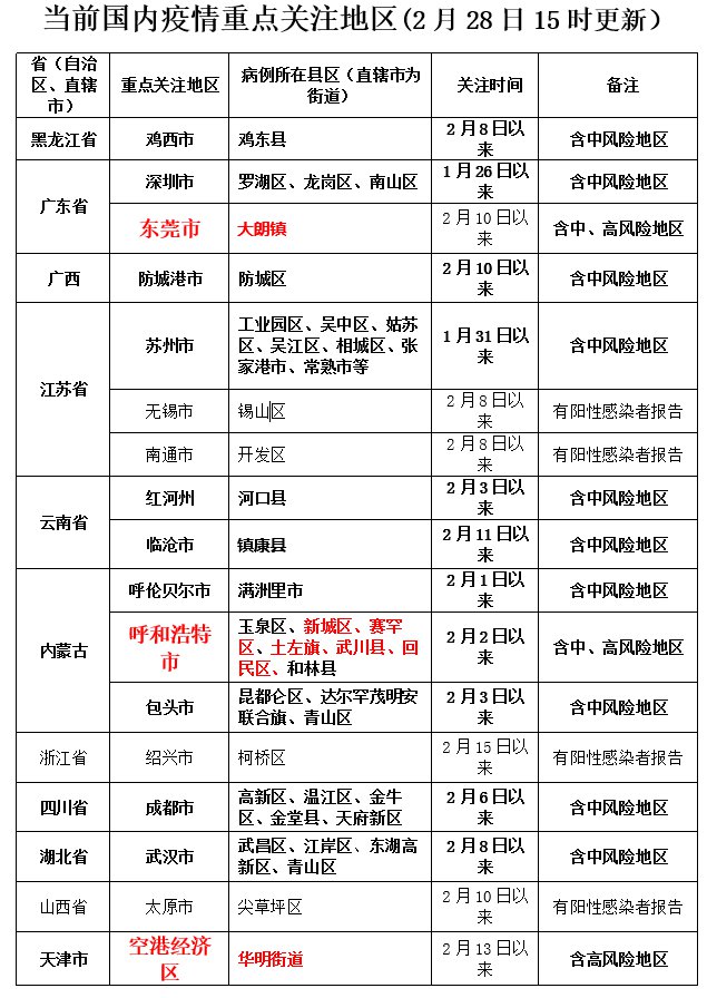 (近日更新情况:上海市普陀区石泉街道,吉林省延边州珲春市,黑龙江省黑河市爱辉区有新增中风险地区。中字体加大飘红表示该地存在高风险地区。字体加粗表示该地存在中风险地区;不飘红不加粗字体表示该地有阳性感染者报告,属于重点关注地区。)