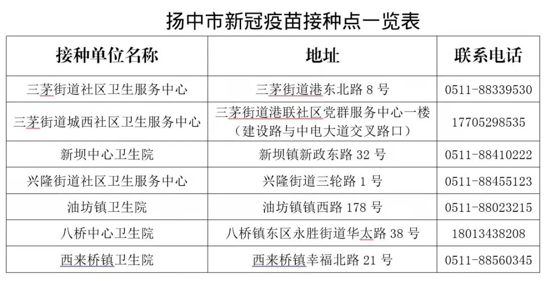 扬中市新冠疫苗接种点一览表